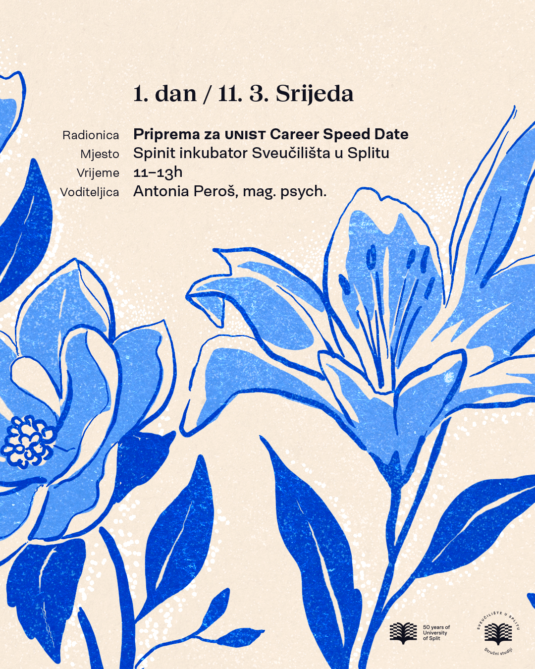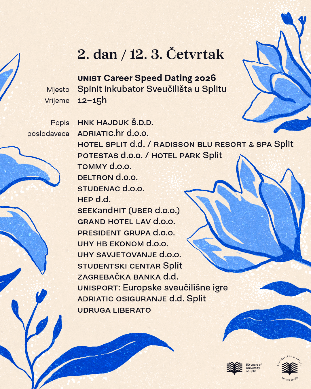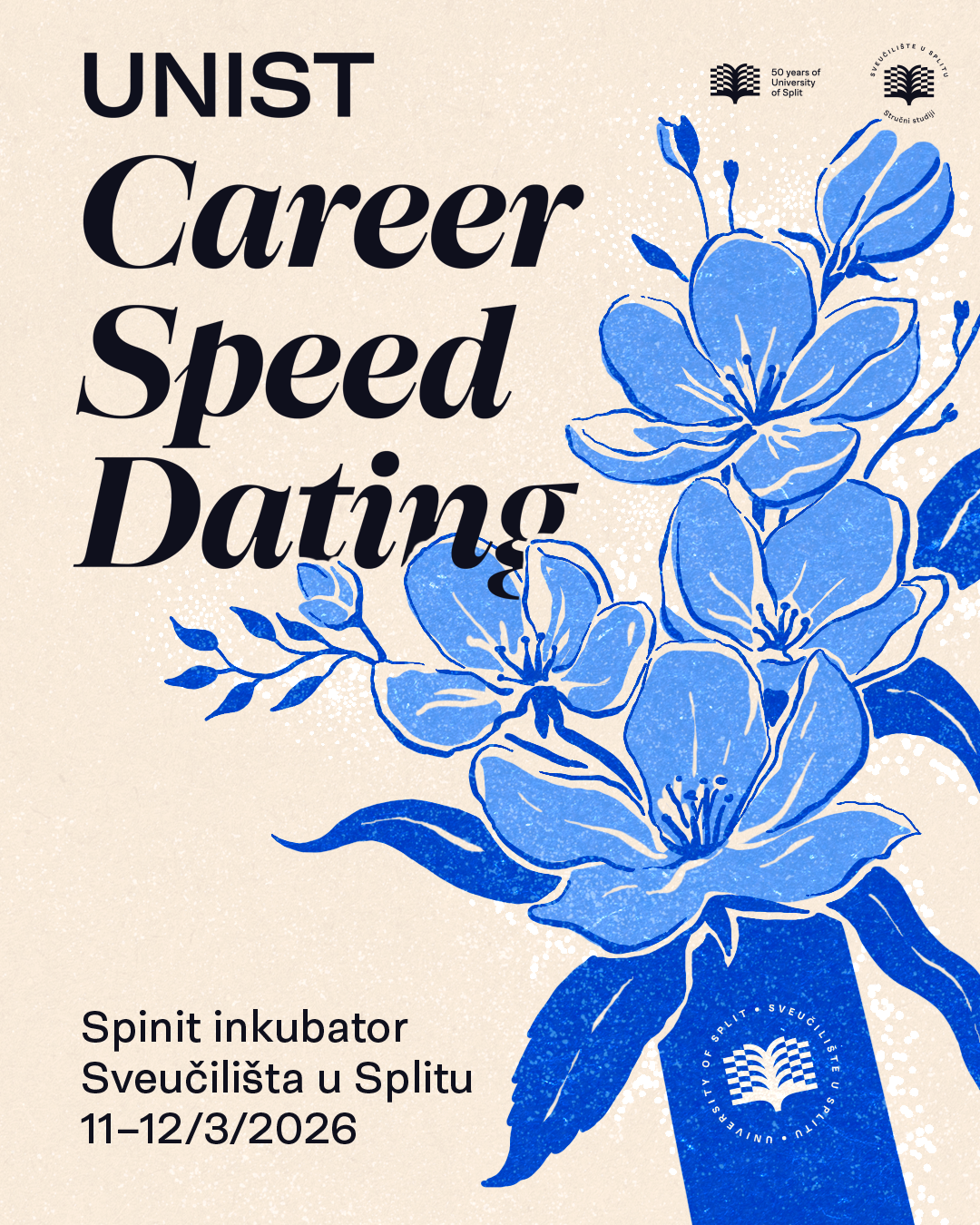 Studenti Sveučilišta u Splitu imat će priliku u kratkom vremenu upoznati brojne poslodavce i predstaviti se potencijalnim budućim poslodavcima na petom UNIST Career Speed Datingu koji će se održati u četvrtak, 12. ožujka, od 12 do 15 sati, u multifunkcionalnoj dvorani SPINIT inkubatora Sveučilišta u Splitu, Matoševa 56.